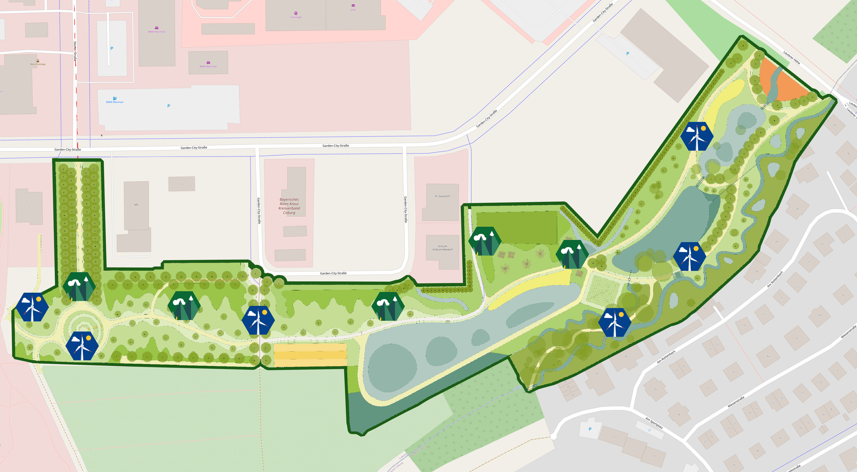 Das KlimAReal liegt im Park der Arten, gleich neben dem Landratsamt Coburg. Zugänge zum Park gibt es über die Garden-City-Straße, über den Parkplatz des Landratsamts und über die Straße Lauterer Höhe. Wir empfehlen eine klimafreundliche Anreise, zum Beispiel mit dem Bus. Genutzt werden können die Haltestellen „Coburg Landratsamt“ (Linien 1402, 1410, 1437, 1468; 250 Meter Fußweg), „Coburg Lauterer Höhe/OBI“ (Linie 1403; 450 Meter Fußweg), sowie „Dörfles-Esbach Wendeplatz“ (Linien 1403, 1423, 1424, 1468; 400 Meter Fußweg).